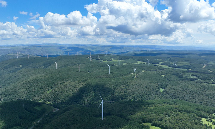 这是河北省围场满族蒙古族自治县御道口镇附近的风电场(2024年7月26日摄,无人机照片)。新华社发(梁子栋摄)