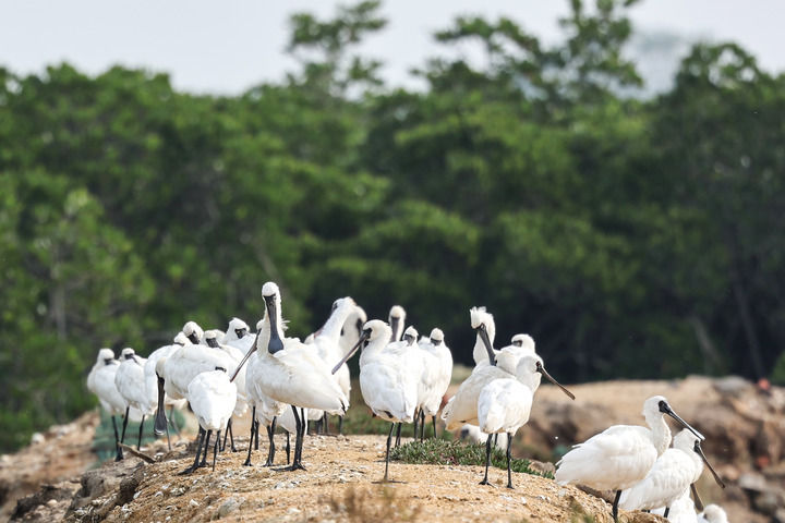 一群黑脸琵鹭在海南新盈红树林国家湿地公园休憩(2023年12月27日摄)。新华社记者 张丽芸 摄