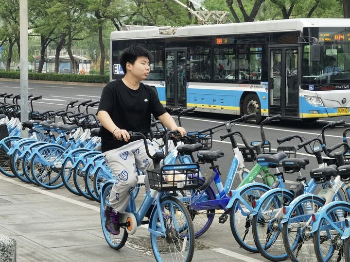 北京街头,一名年轻人使用共享单车出行(2024年4月22日摄)。新华社记者 洪泽华 摄