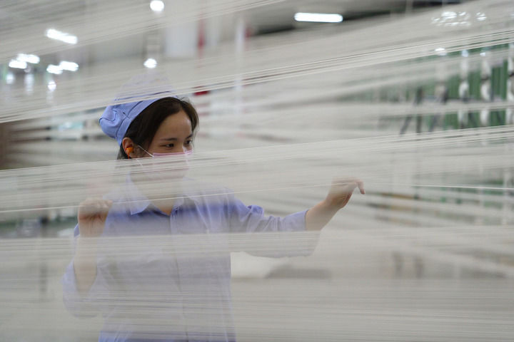 工作人员在位于河南省平顶山市的中国平煤神马集团帘子布发展公司布机车间检查丝线情况(2024年3月28日摄)。中国平煤神马集团积极延伸煤炭产业链,普通的煤炭被加工成众多高附加值衍生产品。新华社记者 李嘉南 摄