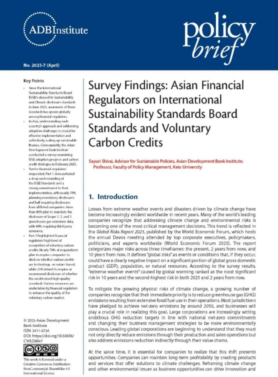 《调查结果:亚洲金融监管机构对ISSB标准和自愿碳信用额的应用》4月24日 亚洲开发银行学院(Survey Findings: Asian Financial Regulators on International Sustainability Standards Board Standards and Voluntary Carbon Credits)
