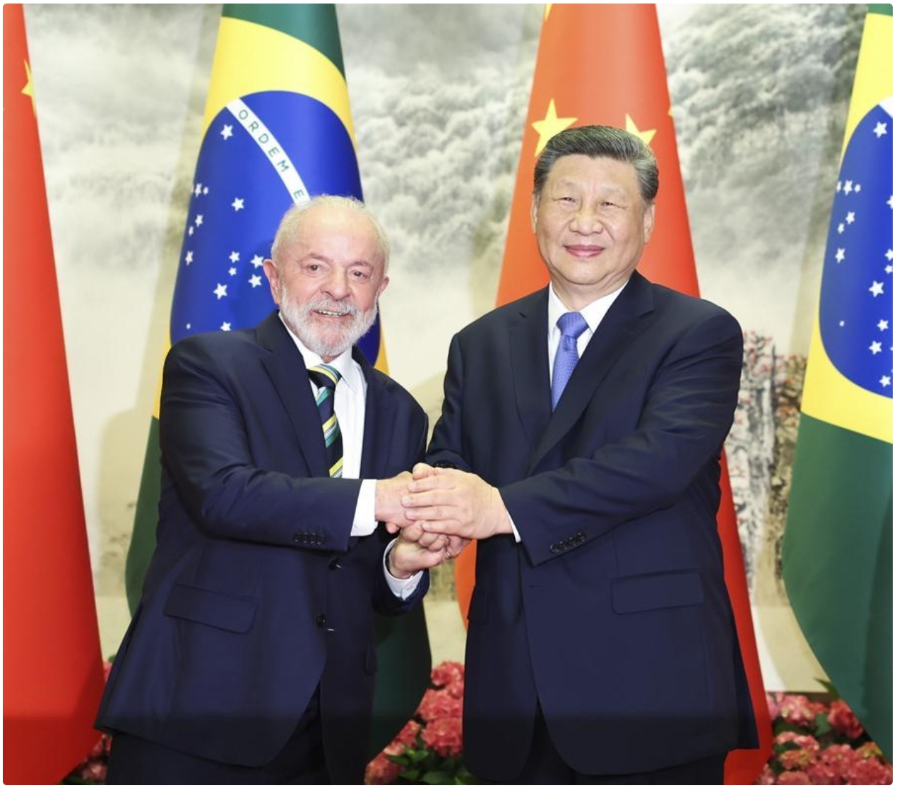 5月13日,国家主席习近平在北京人民大会堂同来华进行国事访问的巴西总统卢拉举行会谈,双方发表《中华人民共和国和巴西联邦共和国关于强化携手构建更公正世界和更可持续星球的中巴命运共同体,共同维护多边主义的联合声明》,丰富中巴命运共同体内涵,深化“一带一路”倡议同巴西发展战略有效对接,发挥好两国各项合作机制作用,加强基础设施、农业、能源等传统领域合作,拓展能源转型、航空航天、数字经济、人工智能等合作新疆域,为两国务实合作打造更多亮点。(新华社)