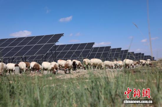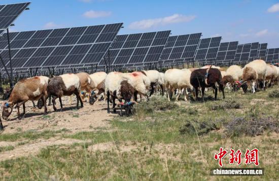 9月17日,羊群在光伏板下吃草。