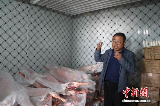 9月17日,共和县一家“光伏羊”销售商家展示冷冻储存的羊肉。